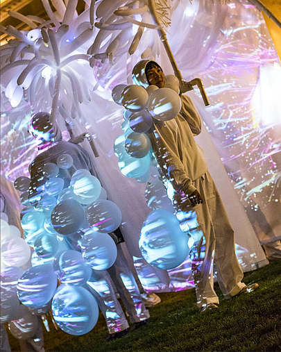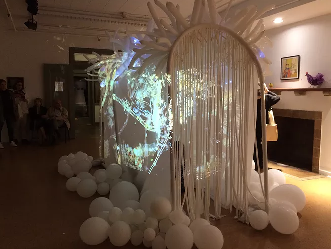 The Proto-Floto is a primordial protozoan blob that transports life beyond our universe. It is a flowing, cilia-covered, single-cellular organism that functions as a literal and metaphoric wormhole, burrowing a passageway and shortcut through the space-time continuum. The Proto-Floto is a fickle and “flam-buoyant” creature, with vibrant colors and imagery shifting on its outer “skin,” much like a chameleon. The microscopic organisms magnified on its surface were collected from Lower Arroyo Park in Pasadena.